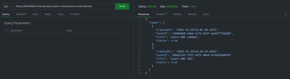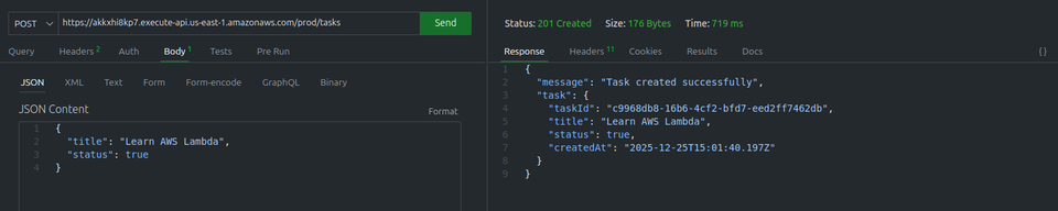 PutCommand): We send thetaskItemobject to the DynamoDB table. This is the actual write operation. - API response: