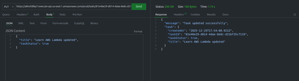 requestBody. If only the title is provided, it updates only the title. This prevents accidentally overwriting other data. UpdateExpression: It’s a small “magic” statement (e.g., SET title = :title) that tells DynamoDB exactly what to modify.ExpressionAttributeValues: For security reasons, we do not place the values directly in the statement. Instead, we use “aliases” (like :title) to safely inject the data.ReturnValues: 'ALL_NEW': It asks DynamoDB to return the object after the modification.